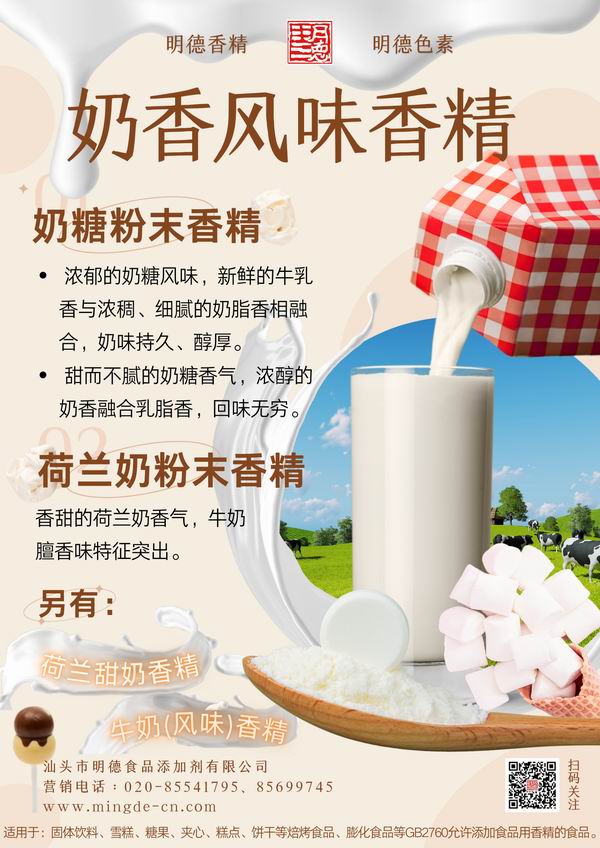 此外,汕頭市明德食品添加劑有限公司在數(shù)十年的研發(fā)中還推出了許多奶香風(fēng)味香精。歡迎廠家們了解嘗試~
