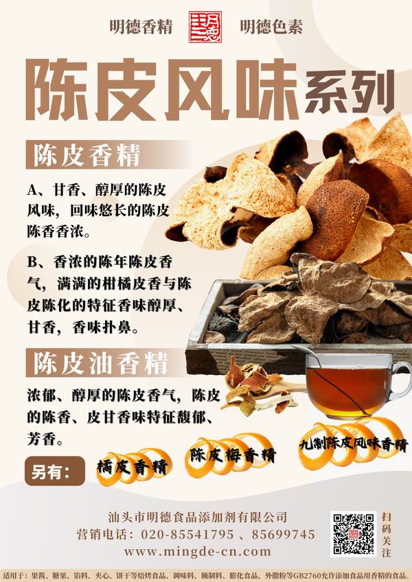 明德食品添加劑 緊跟市場潮流,應(yīng)運而生 推出了 陳皮香精。愿使各位食品生產(chǎn)廠家朋友們更好的在新風(fēng)味浪潮中,占領(lǐng)市場先機優(yōu)勢,永立潮頭。