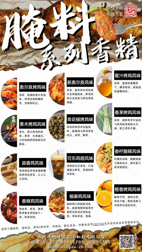 烤肉香精領域我們潛心專研,結合市場潮流,消費者喜好,汕頭市明德食品添加劑有限公司現(xiàn)有多種烤肉相關風味的香精,供您選擇。并持續(xù)努力研發(fā)更多符合市場需求的風味。
