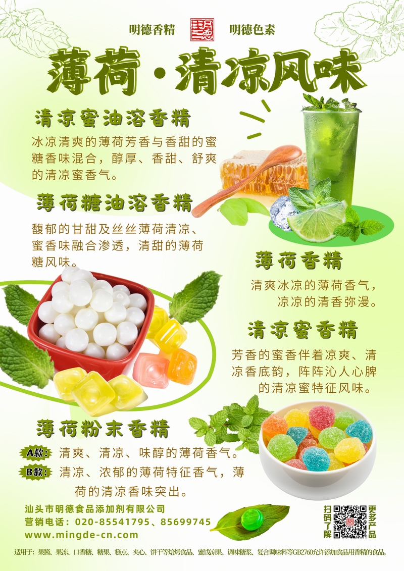 明德薄荷清涼風(fēng)味香精 清涼薄荷 覆蓋糖果飲品場景汕頭市明德食品添加劑有限公司推出的薄荷·清涼風(fēng)味香精系列,涵蓋清涼蜜油溶香精、薄荷糖油溶香精、薄荷香精、清涼蜜香精、薄荷粉末香精等多種調(diào)性。產(chǎn)品清涼舒爽、香氣真實(shí),適用于糖果、飲料、口香糖、烘焙食品及復(fù)合調(diào)味等B端應(yīng)用,幫助工廠快速打造沁人心脾的清涼薄荷風(fēng)味。