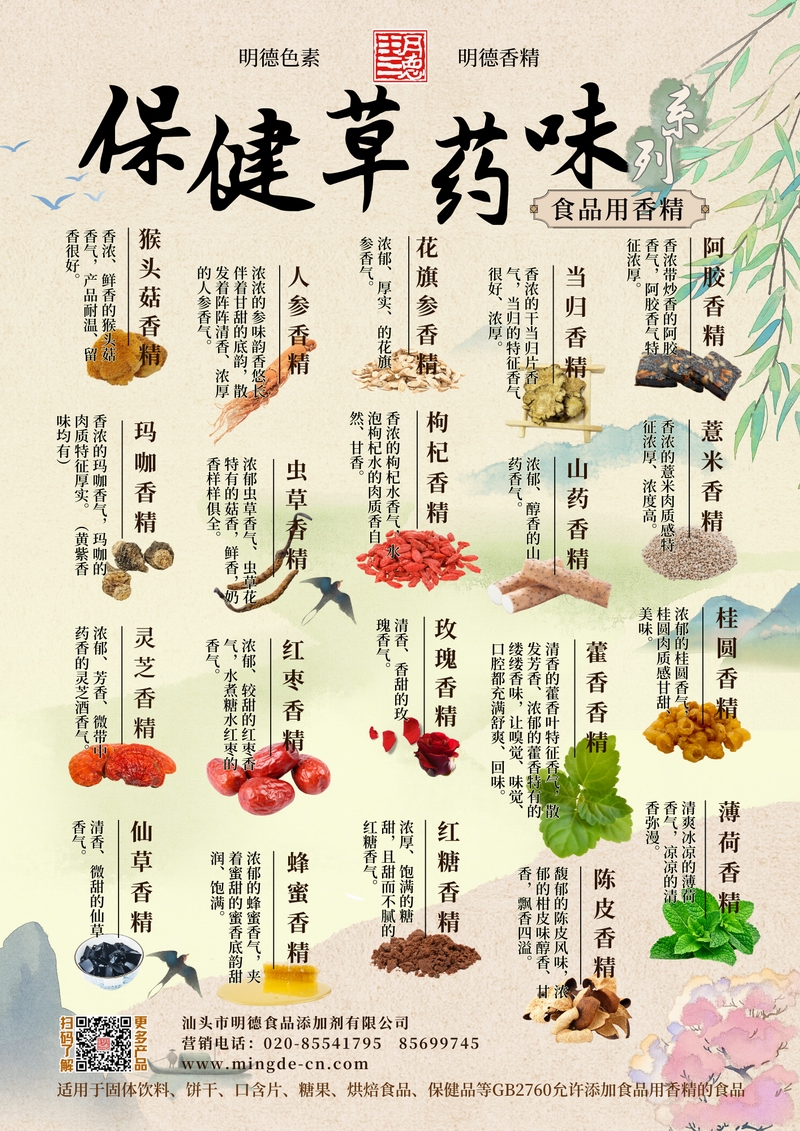 明德香精天然草藥風味香精系列 天然植香 層次鮮明汕頭市明德食品添加劑有限公司專為B端客戶研發(fā)天然草藥風味香精系列。產(chǎn)品模擬多種草藥與植物的天然香氣,清新自然,風味逼真。適用于飲料、糖果、零食、保健品及復合調味品的生產(chǎn),是您打造優(yōu)質草本風味食品的可靠之選。