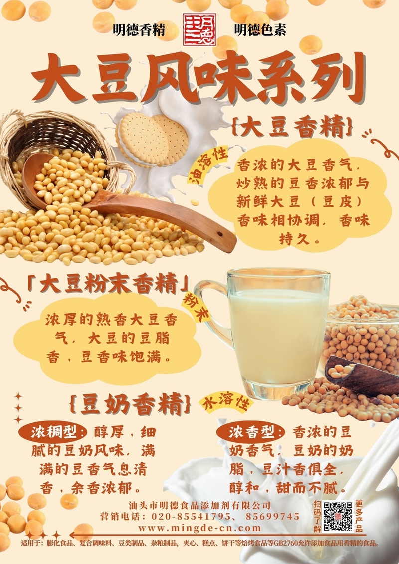 如需獲取不同版本風(fēng)味樣品或配方方案,歡迎聯(lián)系明德團(tuán)隊(duì)。我們致力于為食品工廠提供真實(shí)、安全、高性價(jià)比的香精解決方案。汕頭市明德食品添加劑有限公司推出的大豆風(fēng)味系列香精,覆蓋大豆香精、大豆粉末香精、豆奶香精等多種調(diào)性,風(fēng)味真實(shí),留香穩(wěn)定,適用于膨化休閑、復(fù)合調(diào)味、豆制品及飲料等B端工廠,幫助快速打造具有記憶點(diǎn)的大豆類(lèi)風(fēng)味。