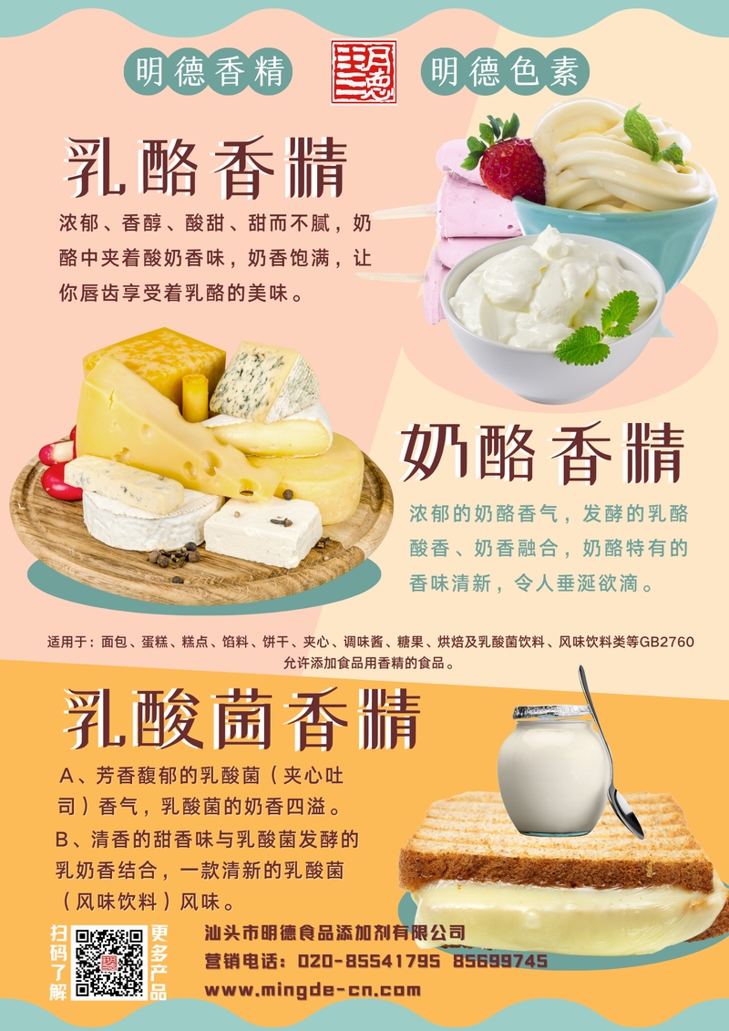 明德乳酪風(fēng)味系列香精 豐富乳品風(fēng)味 助力高品質(zhì)應(yīng)用汕頭市明德食品添加劑有限公司推出的乳酪風(fēng)味系列香精,涵蓋乳酪香精、奶酪香精、乳酸菌香精等多種調(diào)性,風(fēng)味層次包括發(fā)酵香、奶香、酸甜香等,留香穩(wěn)定,可滿足烘焙、飲料、糖果及復(fù)合調(diào)味等B端工廠的應(yīng)用需求。